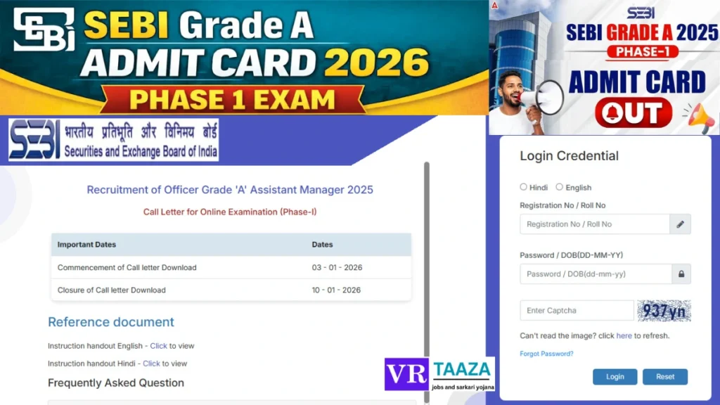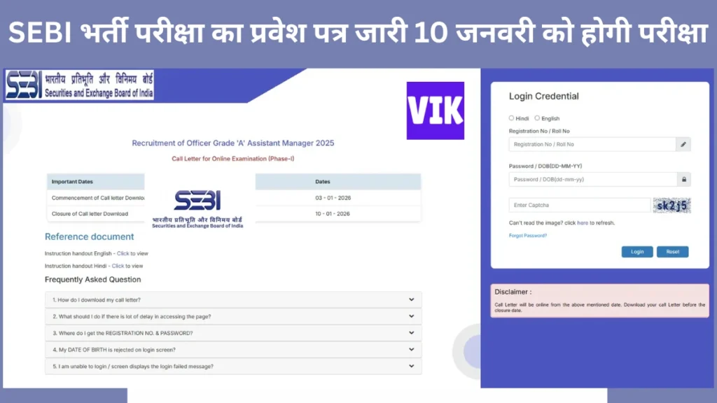 सेबी ग्रेड A एडमिट कार्ड 2025 – SEBI Grade A 2025 Admit Card | SEBI भर्ती परीक्षा का प्रवेश पत्र जारी, 10 जनवरी को होगी परीक्षा